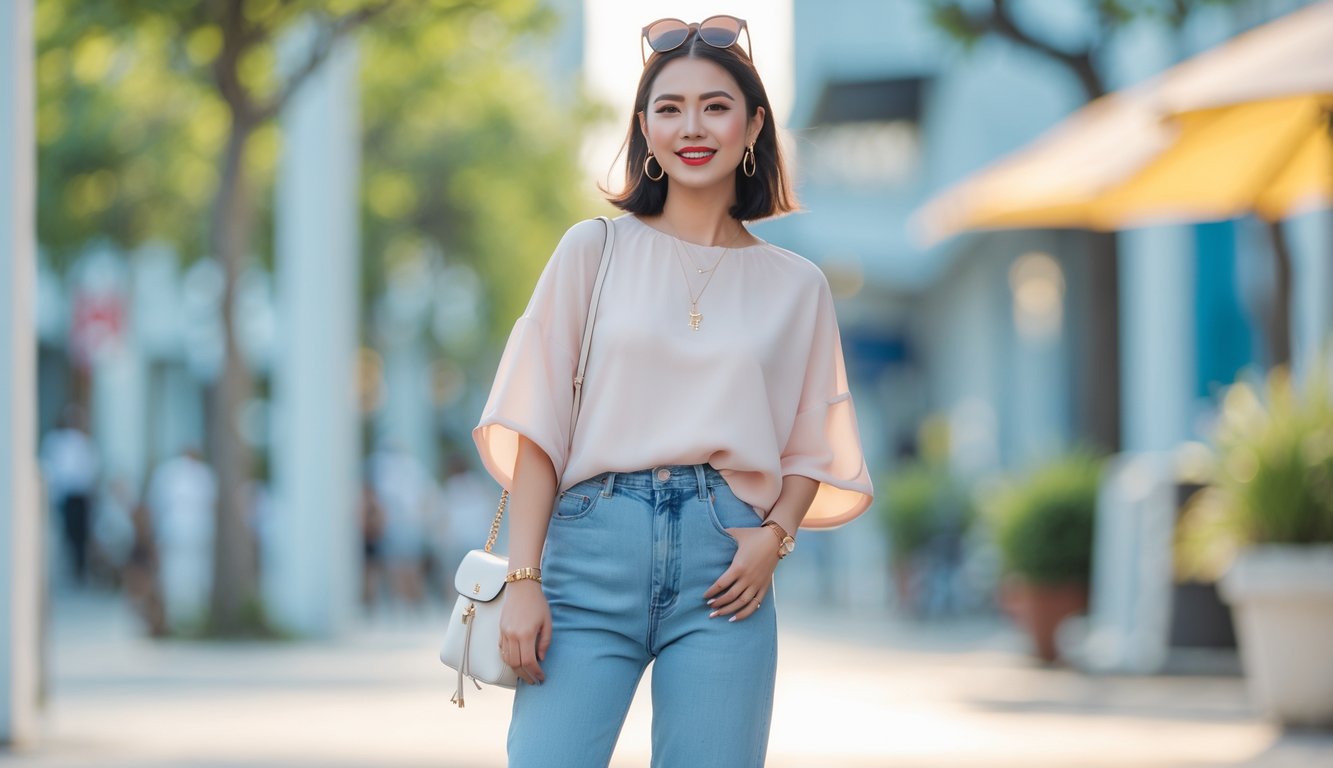 Celana jeans dengan potongan slim atau straight memberikan siluet yang ramping. Untuk menambah gaya, dapat dipakai dengan sneakers putih atau sandal datar. Aksesori seperti kalung berlapis atau jam tangan yang minimalis dapat menambah kesan fashionable.