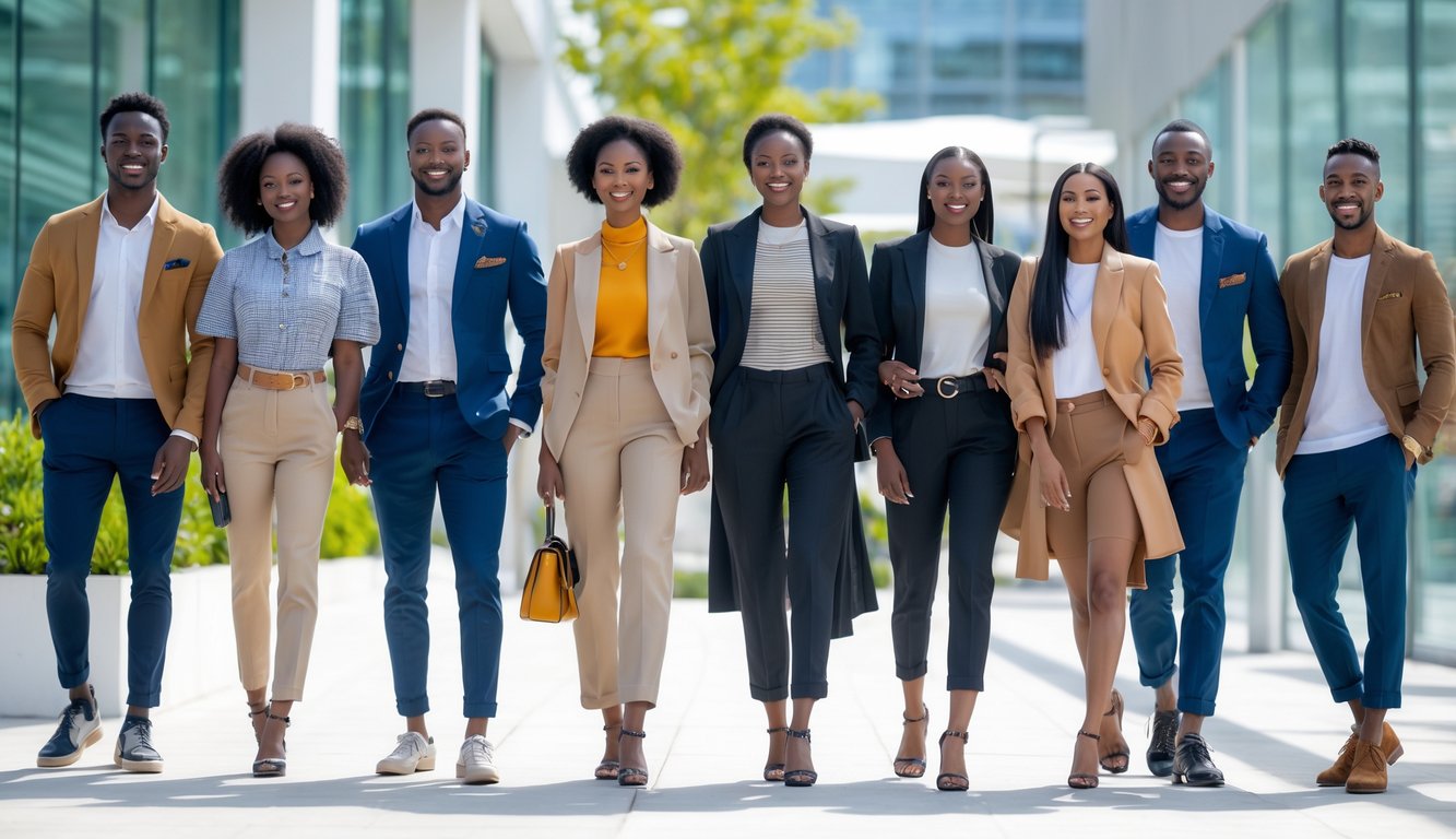 Sekelompok pria dan wanita dengan berbagai pakaian modis dan percaya diri di lingkungan perkotaan yang cerah.