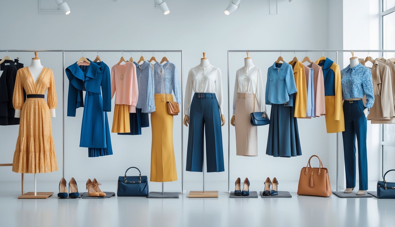 Beberapa wanita mengenakan berbagai pakaian modis dengan latar belakang studio yang terang dan bersih.